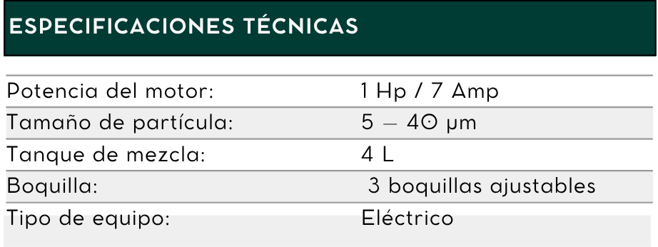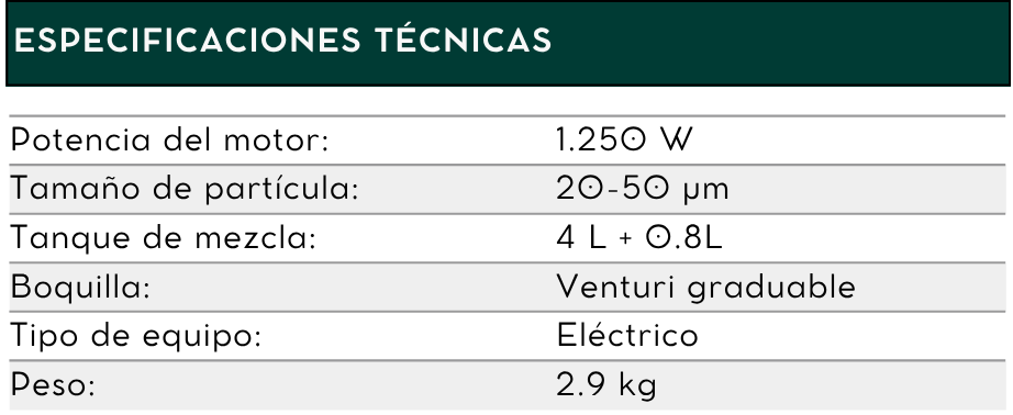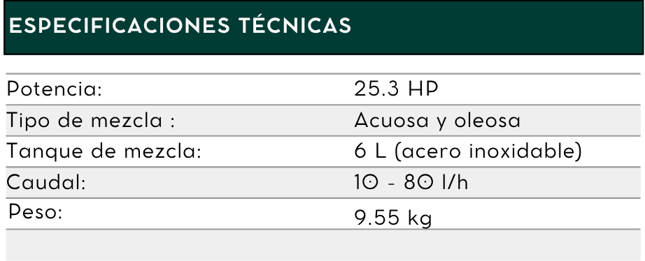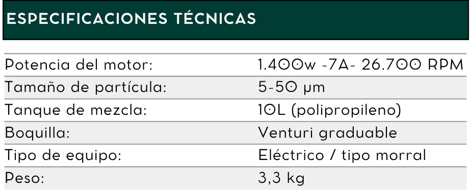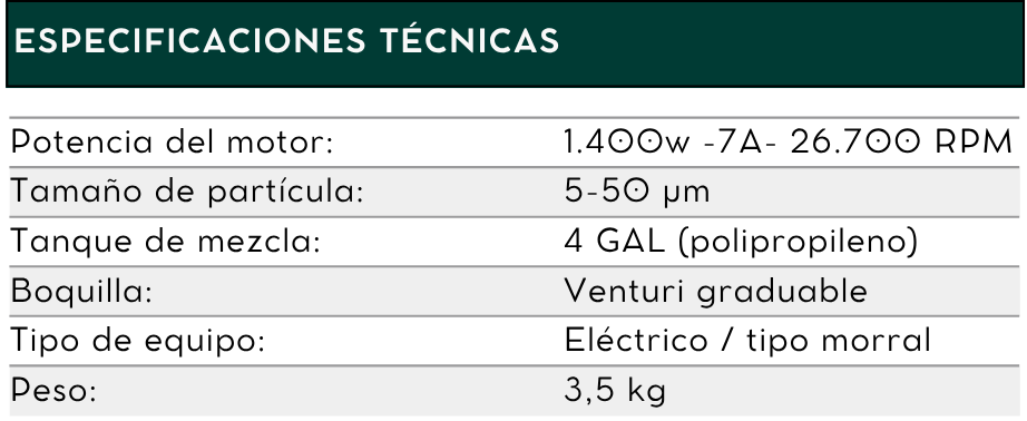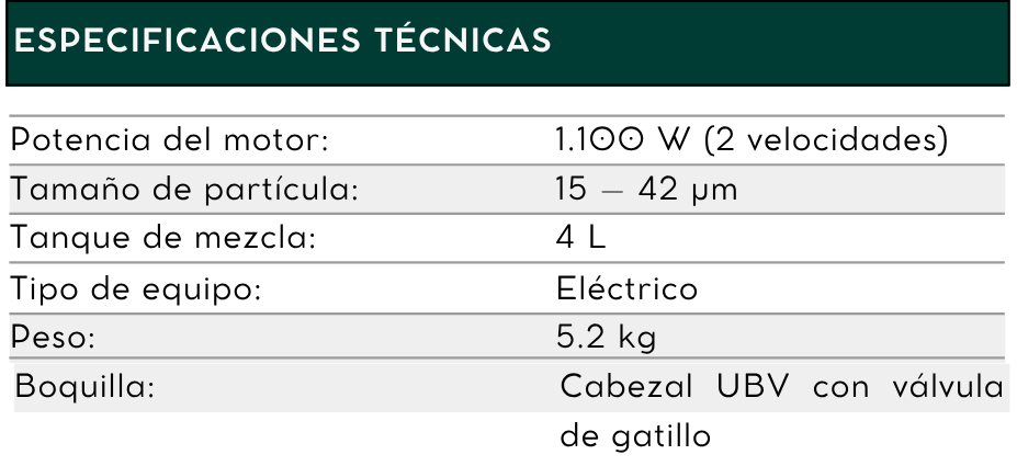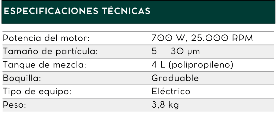 Este equipo está diseñado para entornos exigentes como hospitales, laboratorios y plantas industriales. Su potente motor de 1.100 W con doble rotación y cabezal UBV aseguran una dispersión uniforme y controlada. El tanque de 4 litros resistente a rayos UV y su sistema de corte instantáneo lo hacen ideal para aplicaciones de alta precisión y eficiencia.