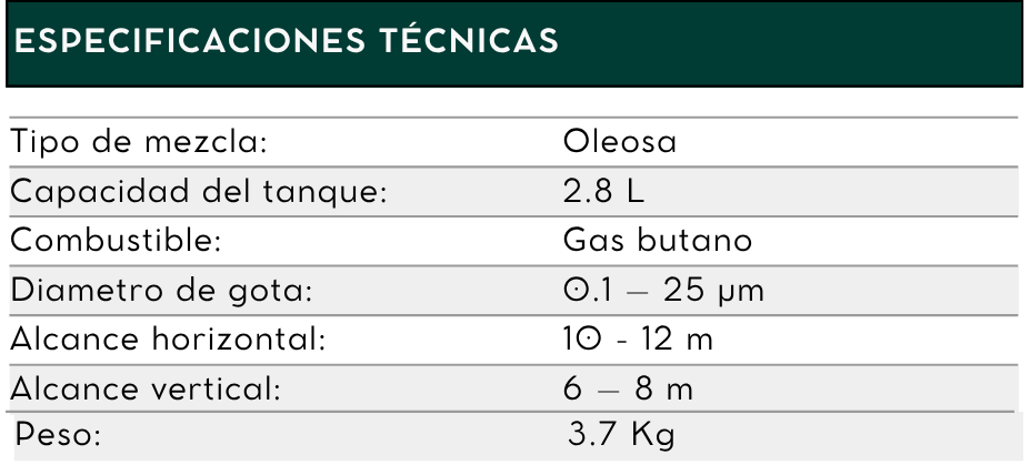 Ideal para uso ocasional en bodegas, establos y espacios pequeños. Ligero, portátil y fácil de usar, el JUNIOR RR 3850 utiliza gas butano para generar una niebla de alta dispersión. Su tanque de 2L y peso de 1.8 kg lo convierten en una opción accesible para tareas de fumigación en áreas reducidas.