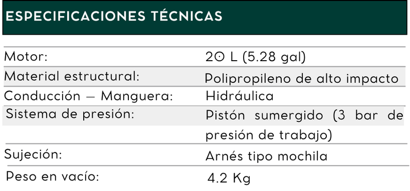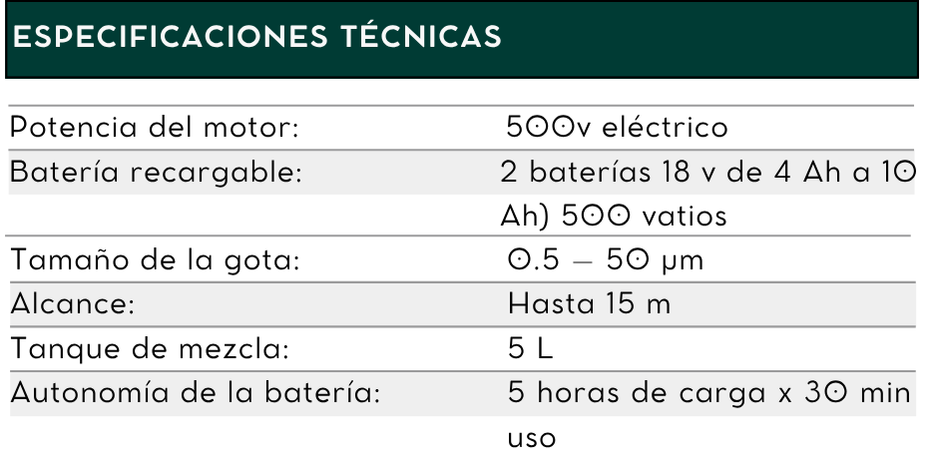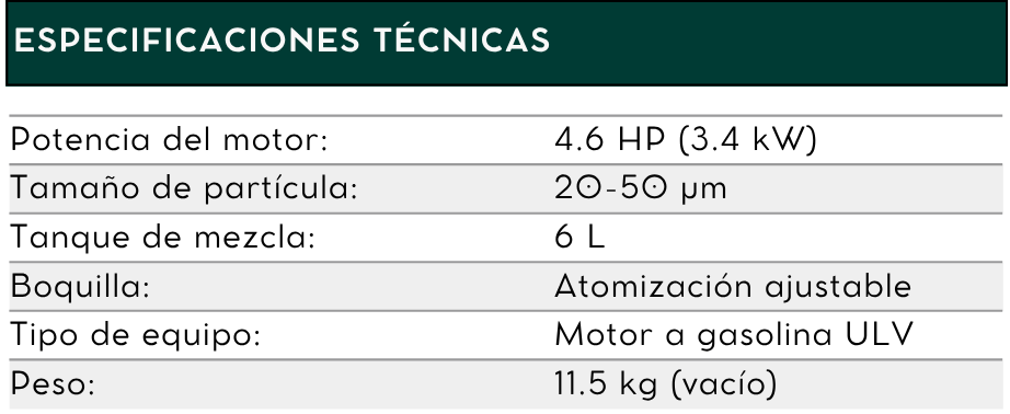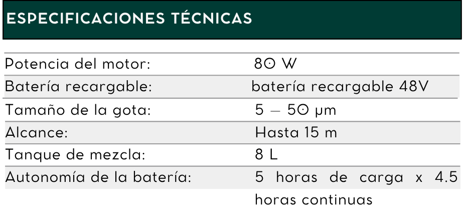 Su gran capacidad operativa, autonomía y alcance lo convierten en la herramienta ideal para productores, técnicos y operarios que enfrentan infestaciones severas, logrando eficiencia en tiempo, producto aplicado y cobertura en campo.