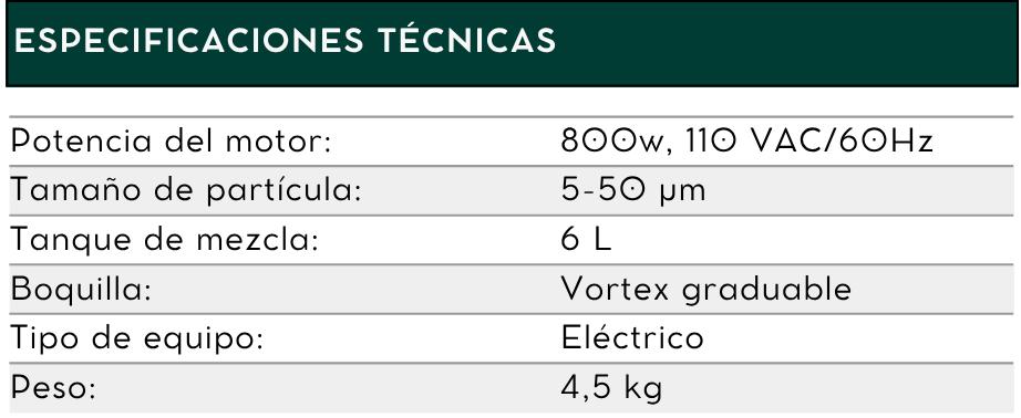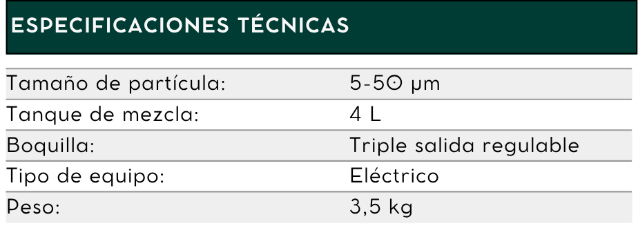 Diseñado para quienes buscan precisión y calidad en cada aplicación, este equipo destaca por su construcción en materiales resistentes como aluminio y bronce, que le brindan durabilidad y elegancia. Con tres boquillas ajustables y la capacidad de generar partículas desde 5 μm, logra una niebla fina y controlada, perfecta para líquidos a base de agua. Compacto pero poderoso, es ideal para trabajos exigentes en ambientes de alta exposición