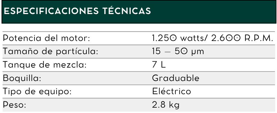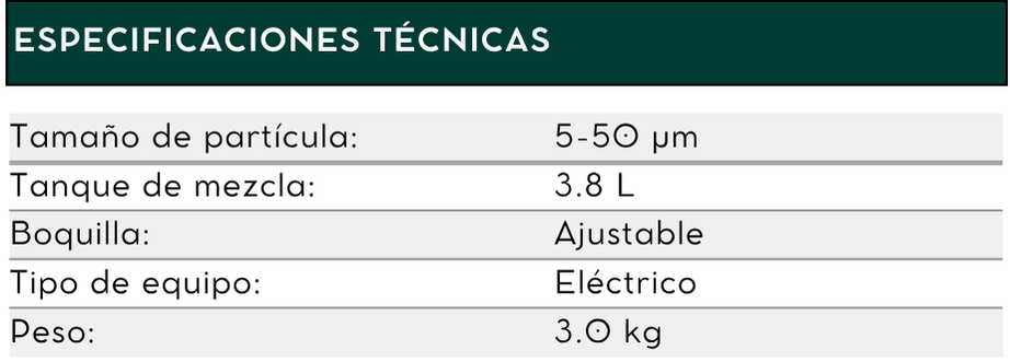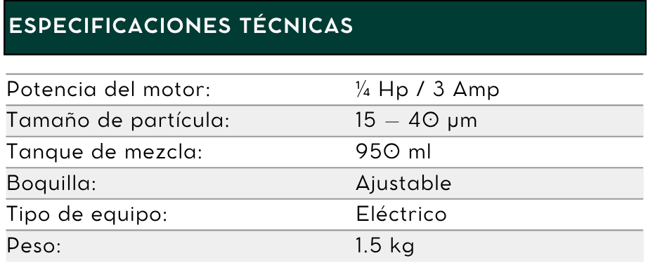Una excelente opción para quienes buscan eficiencia a un precio accesible. Su diseño compacto y liviano facilita el transporte y uso en espacios reducidos, mientras que su tanque de 950 ml y su motor confiable lo hacen ideal para tareas de mediana exposición. Su boquilla ajustable permite variar el tamaño de las partículas según tus necesidades, garantizando una cobertura efectiva con el mínimo consumo de producto.
