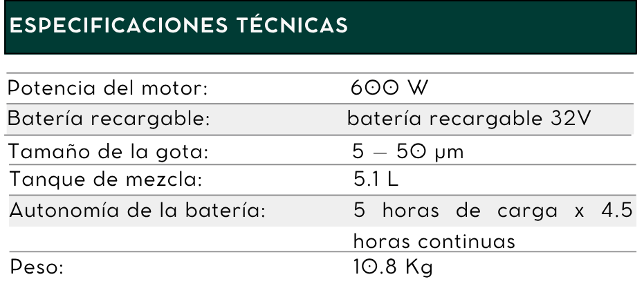 Este nebulizador es la combinación perfecta de potencia, ligereza y duración. Con un motor de 600 W y un tanque de 5.1 L, es el equipo ideal para aplicaciones rápidas y eficientes. Su batería recargable de 32v ofrece 5 horas continuas de funcionamiento, asegurando máxima productividad. Con un diseño funcional, es el aliado perfecto para trabajos intensivos de nebulización