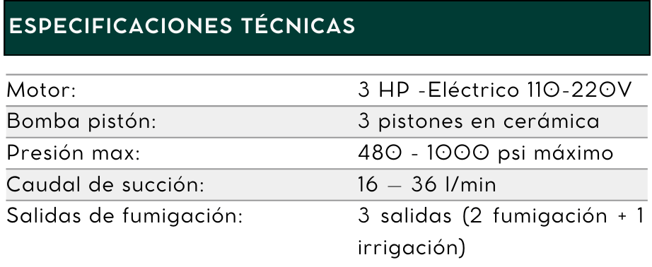 La AGR 680-E es una bomba profesional de alto rendimiento, diseñada en Italia para enfrentar labores intensivas de fumigación e irrigación. Sus componentes en acero y cerámica aseguran durabilidad y precisión, mientras su presión de hasta 725 PSI y motor de hasta 8.5 HP permiten cubrir grandes extensiones con facilidad y fuerza constante.