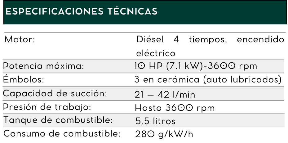 Con motor diésel de 10 HP y bomba autolubricada con émbolos cerámicos, esta estación es ideal para trabajos agrícolas exigentes. Su cámara de aire en acero inoxidable y capacidad de succión de hasta 42 l/min garantizan rendimiento estable y continuo. Pensada para grandes cultivos y largas jornadas sin interrupciones.