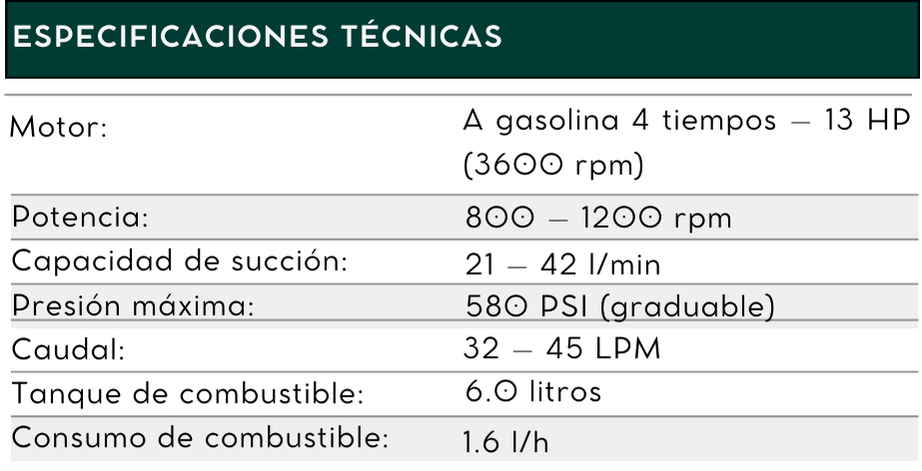 La IRCI R680 está equipada con un potente motor de 13 HP y bomba de 3 pistones en cerámica, lo que le permite alcanzar un caudal superior (hasta 45 LPM). Perfecta para extensiones grandes, ofrece autonomía, potencia y presión constante para aplicaciones profesionales de alto impacto.