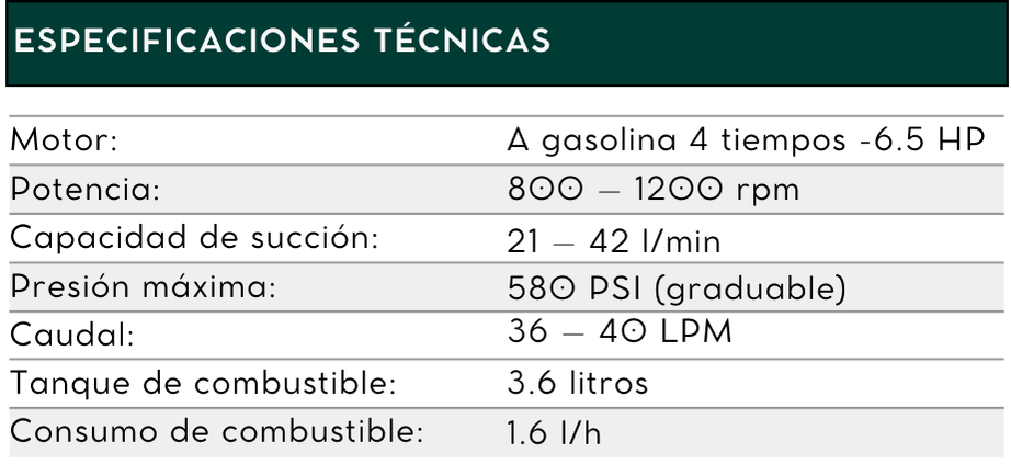 Este modelo estacionario con motor de 6.5 HP a gasolina está diseñado para ofrecer excelente rendimiento con bajo consumo. Sus pistones de cerámica y diseño compacto lo hacen ideal para cultivos medianos. Fácil de operar y mantener, con presión graduable y excelente relación peso-potencia.