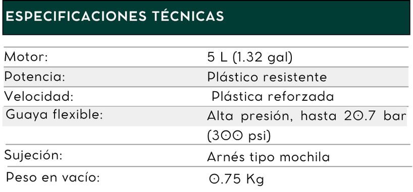 Un equipo potente y robusto diseñado para cubrir grandes superficies con máxima precisión. Su tanque de 7 litros permite largas jornadas de trabajo sin interrupciones, mientras que su motor de alta velocidad y la manguera de descarga de 80 cm garantizan un alcance impresionante. La boquilla graduable y el ajuste fino del rocío te permiten controlar el tamaño de las gotas y la intensidad del nebulizado, logrando una dispersión uniforme y eficiente, incluso en áreas difíciles.