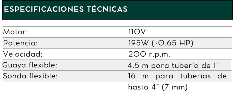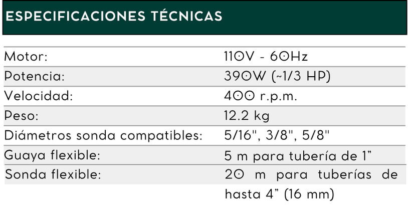 Ideal para destapar cañerías y desagües de lavamanos, duchas o resumideros. Con una estructura robusta y un motor de alto rendimiento, permite trabajar con distintos diámetros de sonda y cubrir diversas necesidades de limpieza en redes sanitarias residenciales o comerciales.